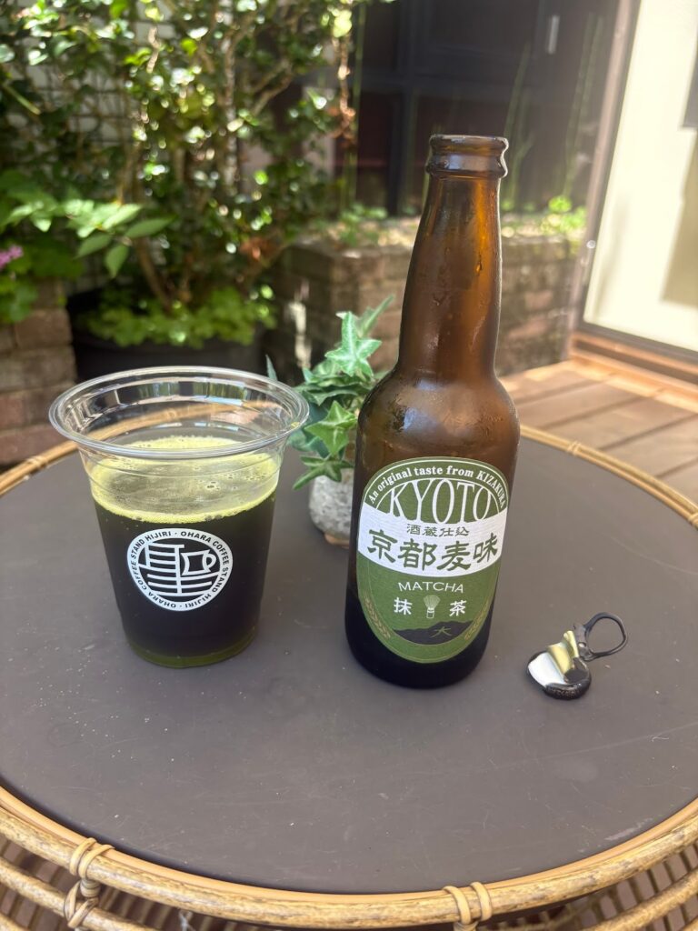 Ohara Coffee offers a variety of coffees plus offers two beers: a Kirin Ichiban lager and a unique IPA called “Kyoto Matcha” that’s been mixed with matcha and brewed using special underground “Fushimizu” spring water. When you order a Kyoto Matcha, you’ll be given a plastic cup; ‘peel’ off the bottle cap, pour the beer into the cup, and watch it fill up with green beer!